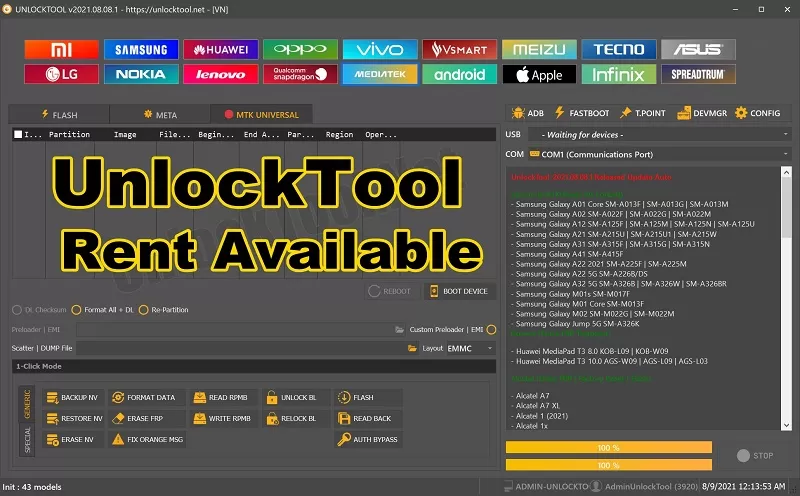 We provide Unlocktool Rent at a rate of 3$ for 12 hours of use. The unlock tool is a very powerful tool for a huge number of jobs, including Unlocking, FRP, flashing, fixing errors, iCloud unlock, Pattern Pin Password reset, Bootloader unlock, KG unlock, Backup NVram, and Auth bypass
